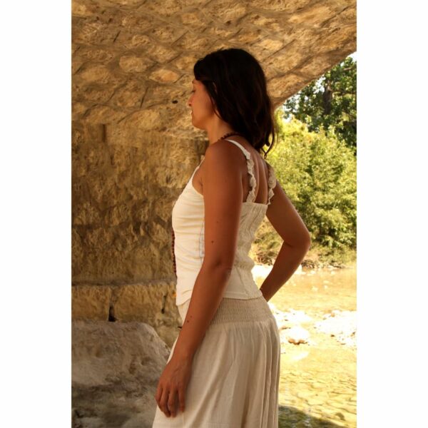 Ce petit haut près du corps est confectionné dans un coton de qualité supérieur, tissé main de façon artisanale. Ce modèle éthique comporte une bande de coton lycra bio de chaque côté de façon à se sentir à l’aise, et à cintrer la poitrine (se porte facilement sans soutien-gorge).